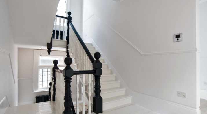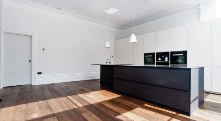 Planning consent was given to convert flats in a double fronted house back into a family house. Partitions and walls were removed to reinstate the layout of the original house. The roof of a single storey square bay at the rear was removed and fitted with structural glass to create a glazed roof over part of the kitchen