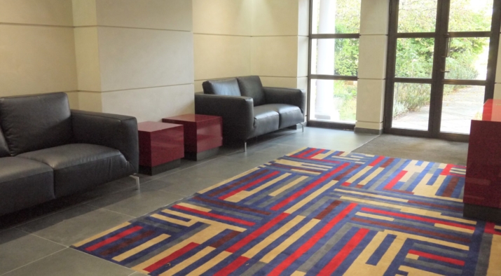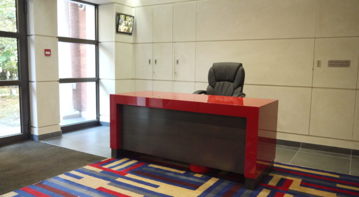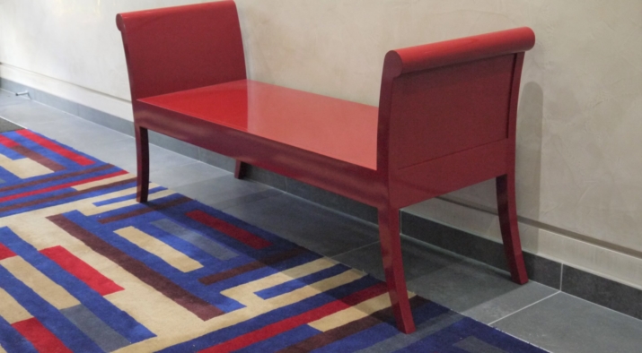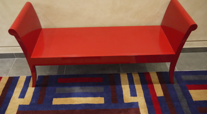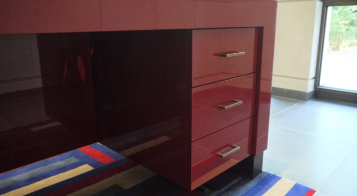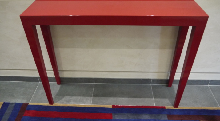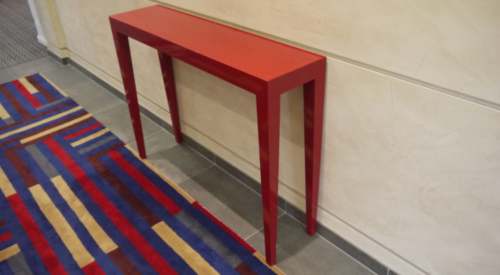 The entrance to the mansion block was redesigned with horizontal panelling finished with a coloured gesso. The joints in the panelling aligns with the glazing bars on the new bronze entrance screen. The lacquered furniture was designed and made up by a specialist cabinet making firm.A secondary entrance was also re-designed with the same panelling and a bench and console table designed and made up.